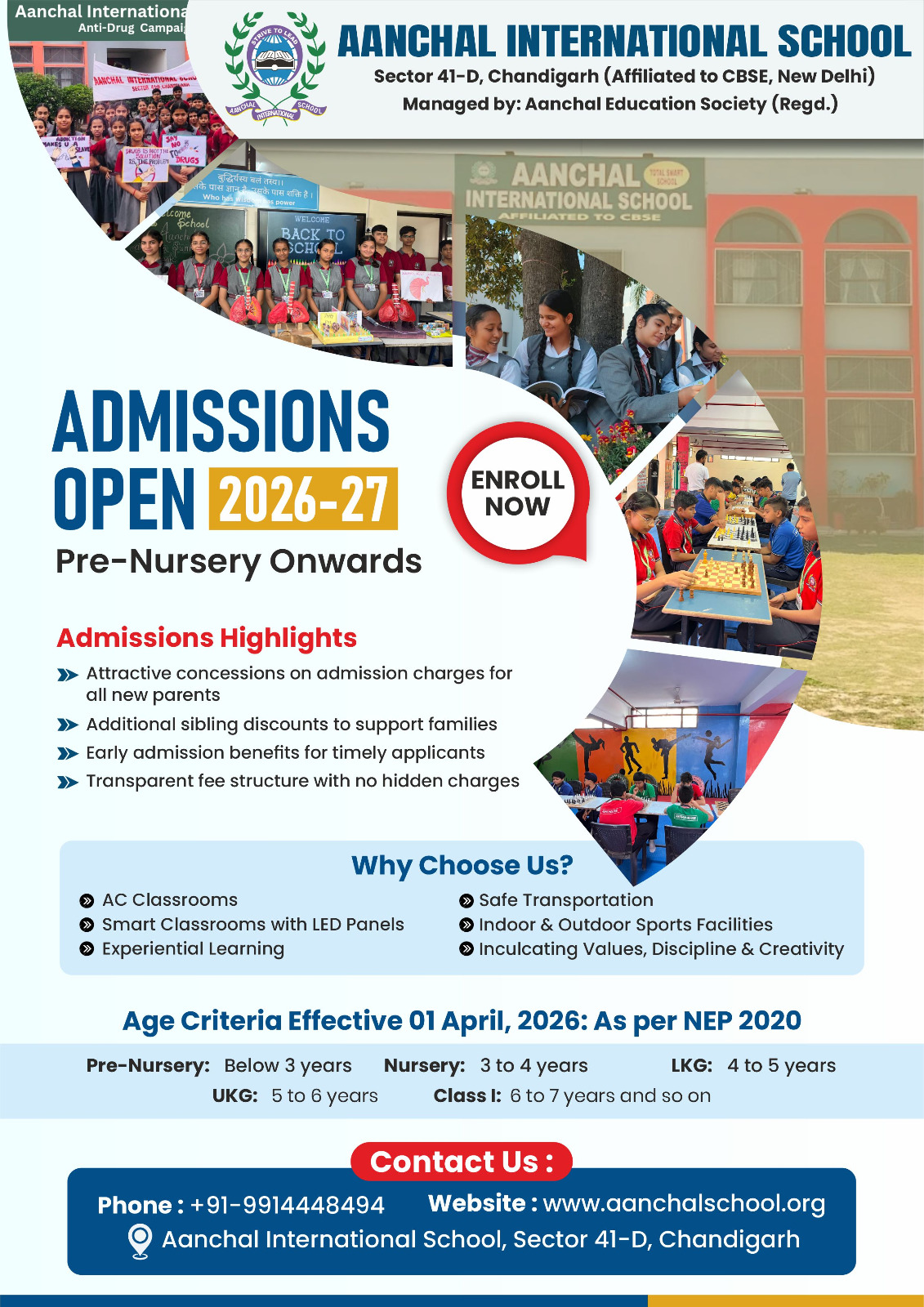 Aanchal International School, located in Chandigarh Sector 41-D, stands out with its spacious and modern building, offering a grand welcome to all. The school is surrounded by vibrant, lush green gardens, filled with flowers of various colors that spread their fragrance across the campus. Quality education is the cornerstone of Aanchal International. The focus is on excellence, with the mission of guiding students to recognize the social challenges around them. The school fosters a stimulating environment, encouraging creative thinking and growth through life-centered, engaging teaching methods.